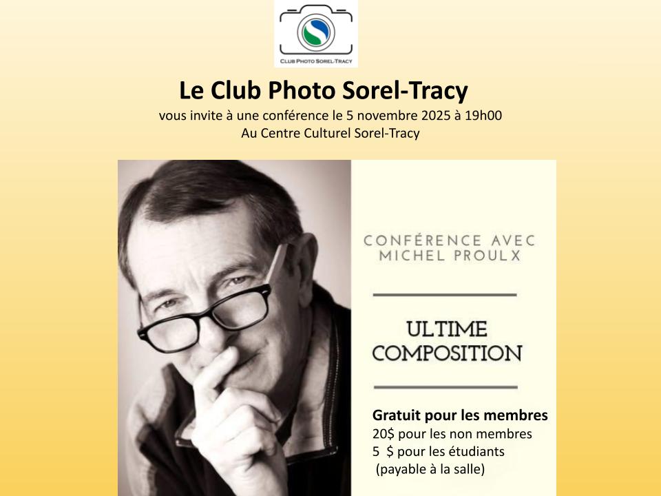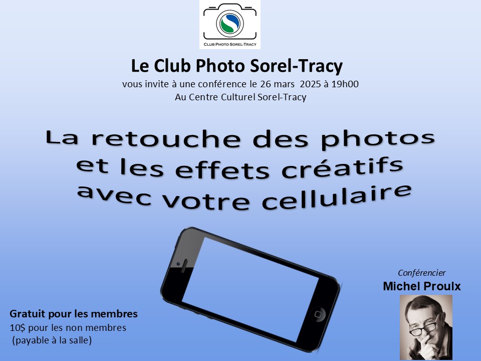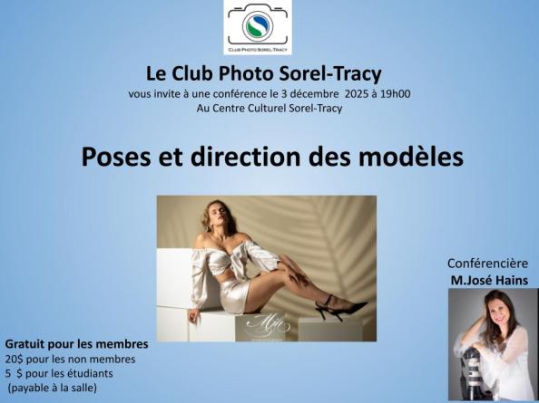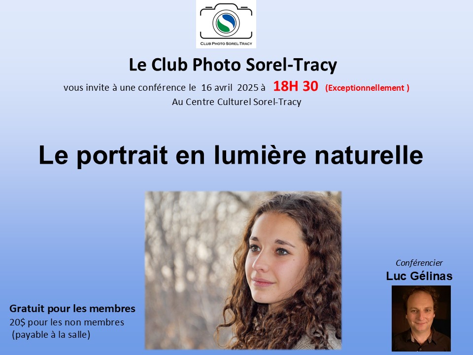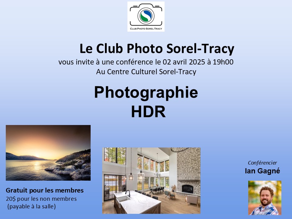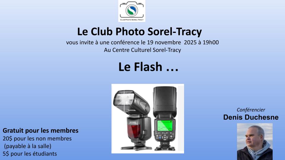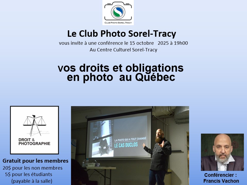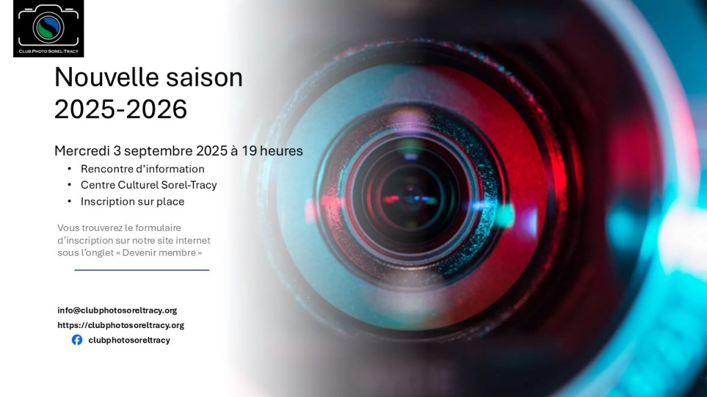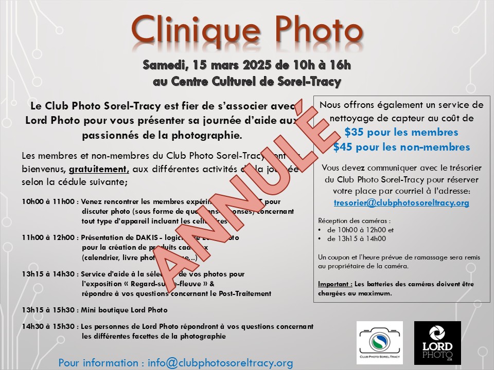 Suite à un faible taux d’inscription, Le Club Photo Sorel-Tracy se voit contraint d’annuler sa clinique annuelle sur la photographie qui devait avoir lieu le 15 mars 2025 de 10h00 à 16h00 au Centre culturel de Sorel-Tracy