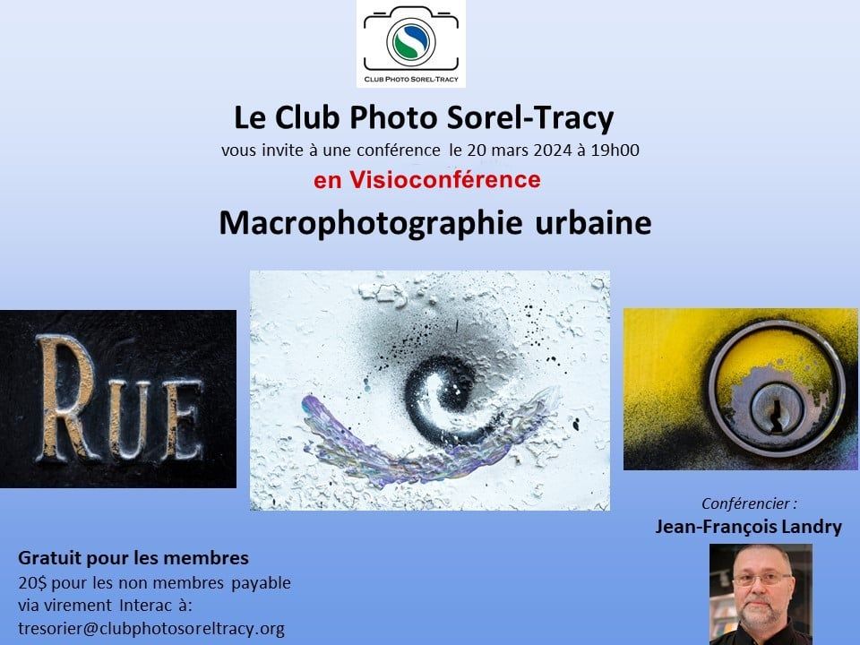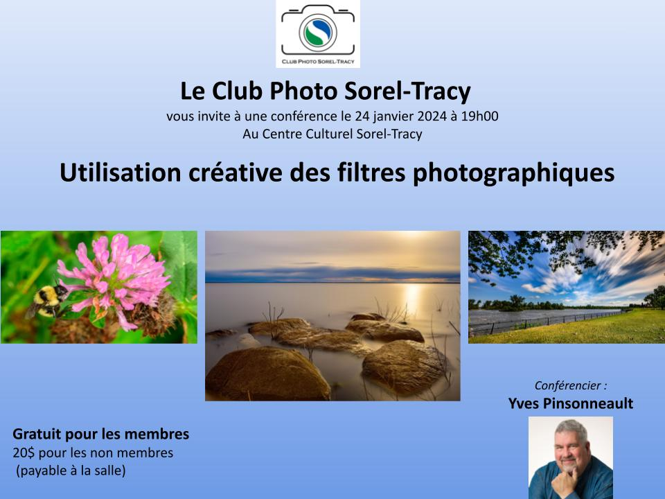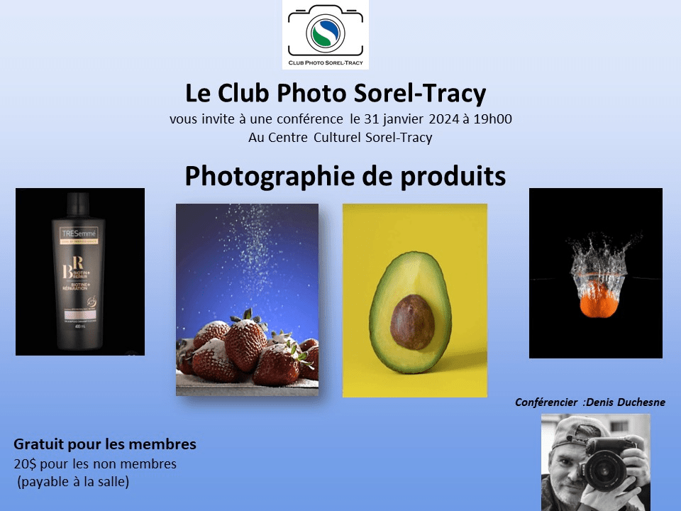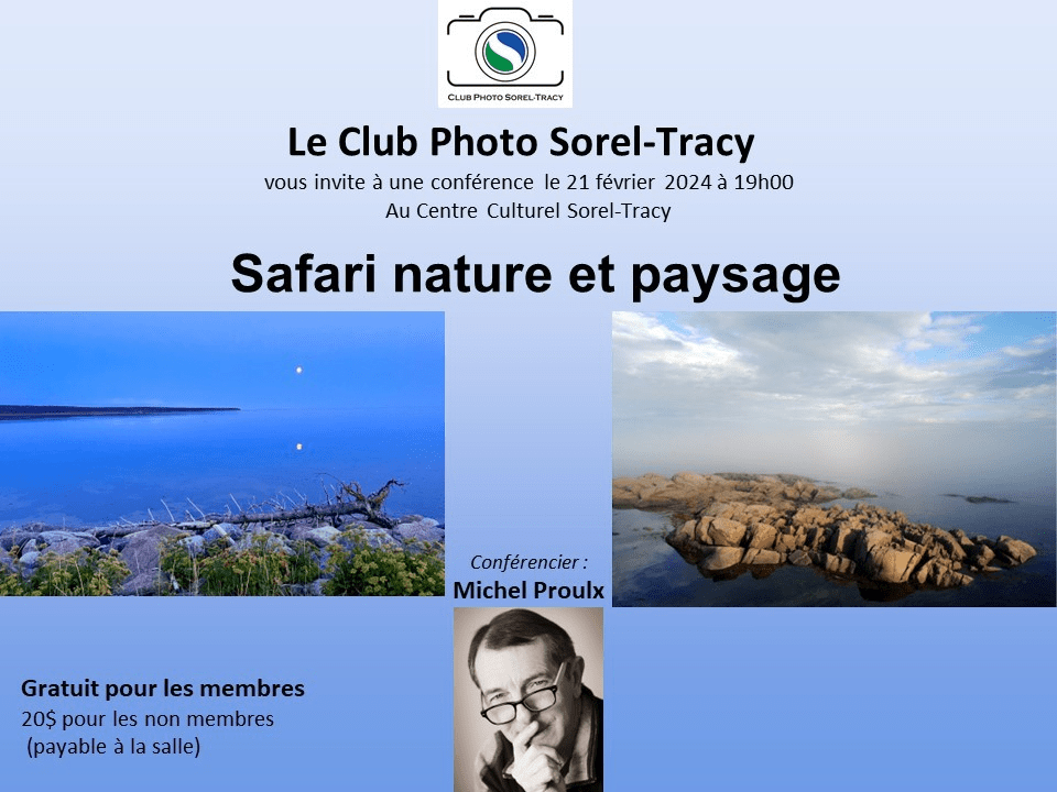 La 1ere conférence de l’année 2024 sera en visioconférence. Inscription à : tresorier@clubphotosoreltracy.org au coût de 20$ pour les non-membres. Publié le 4 janvier 2024 par andreannebeaulieuclubphotosoreltracy Inscription demi-saison pour faire parti du CPST au coût de 55$ également disponible pour le restant de la saison! Bienvenue à tous!