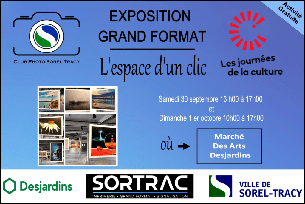 Dans le cadre de la 27e édition des Journées de la culture, le Club Photo Sorel-Tracy est fier de participer à cet évènement en vous proposant son exposition grand format l’espace d’un clic. Avec plus d’une 30 aine d’exposants, cette activité gratuite est parfaite pour découvrir l’univers des arts et de la culture. L’espace d’un clic est une exposition témoignant du moment où le temps s’arrête devant toutes les beautés observées par le photographe. Par leurs photographies, les membres du Club Photo Sorel-Tracy ont voulu partager leurs merveilleux moments avec vous.